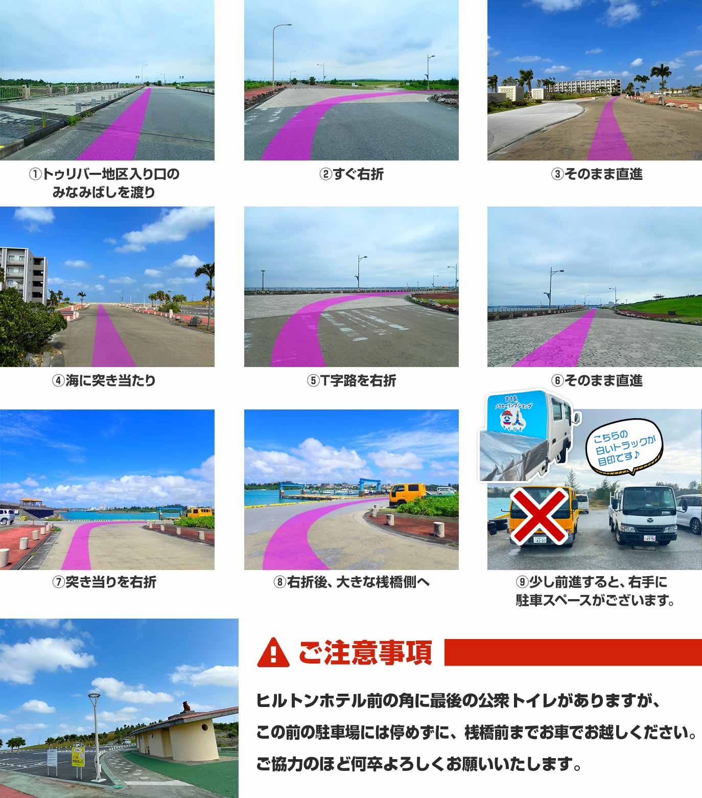 全てのメニューの集合場所は、トゥリバーマリーナ近くの大型桟橋正面の駐車スペースとなります。送迎はございませんので現地集合・現地解散となります。